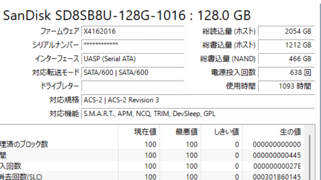 中古ということで、まずはCrystalDiskInfoにて状態確認です。