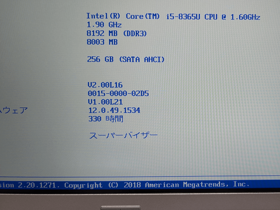 BIOS画面に入って使用時間を確認すると330時間になっており、こちらも商品説明どおりで一安心でした。