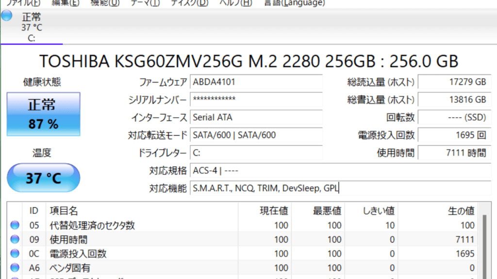 このSSD、使用時間もさることながら、健康状態が87%というのも妙に引っかかります。