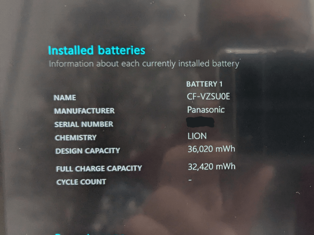 満充電充電状態で、コマンドプロンプトから「powercfg /batteryreport」と入力し、生成されたHTMLファイルを開いてみると、「DESIGN CAPACITY 36,020mWh」に対し「FULL CHARGE CAPACITY 32,420mWh」、つまり残容量90%ということになります。